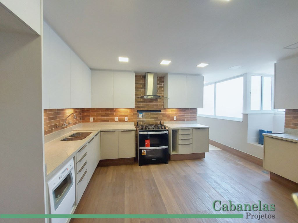 Uma proposta que eu fiz foi aumentar a cozinha diminuindo o hall de entrada do apartamento. Assim a cozinha ficou com tamanho grande junto com a área de serviço. A integração total dos ambientes permitiu uma iluminação ampla da cozinha. Os móveis foram planejados para terem espaço para os objetos da forma que o morador mais gosta.